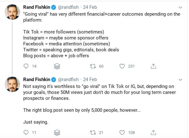 As Rand Fishkin has recently pointed out on Twitter, going viral on Tik Tok is unlikely to bring the same benefits that it would on other social media platforms.