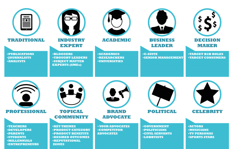 This graphic from Onalytica outlines the different kinds of influencers. All will demonstrate the traits, but each focuses on a specific topic or interest.