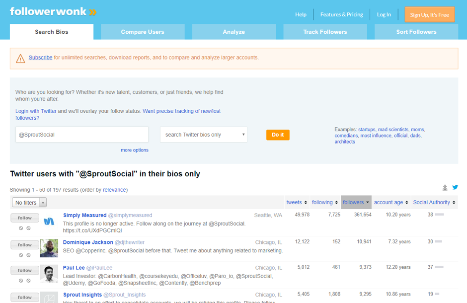 Finally, use a free tool like Followerwonk to search Twitter bios for your company name. It brings up a list of people referencing the brand name in their bio and helps you to filter by followers and social authority. Here’s an example below using our friends at Sprout Social.
