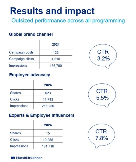 Empower colleagues to share their perspectives, providing the necessary tools and know-how to be effective on social media. Marsh McLennan emphasises how optimising LinkedIn profiles, developing personalised content, and using AI prompts to guide employees with their content is key to scaling advocacy.