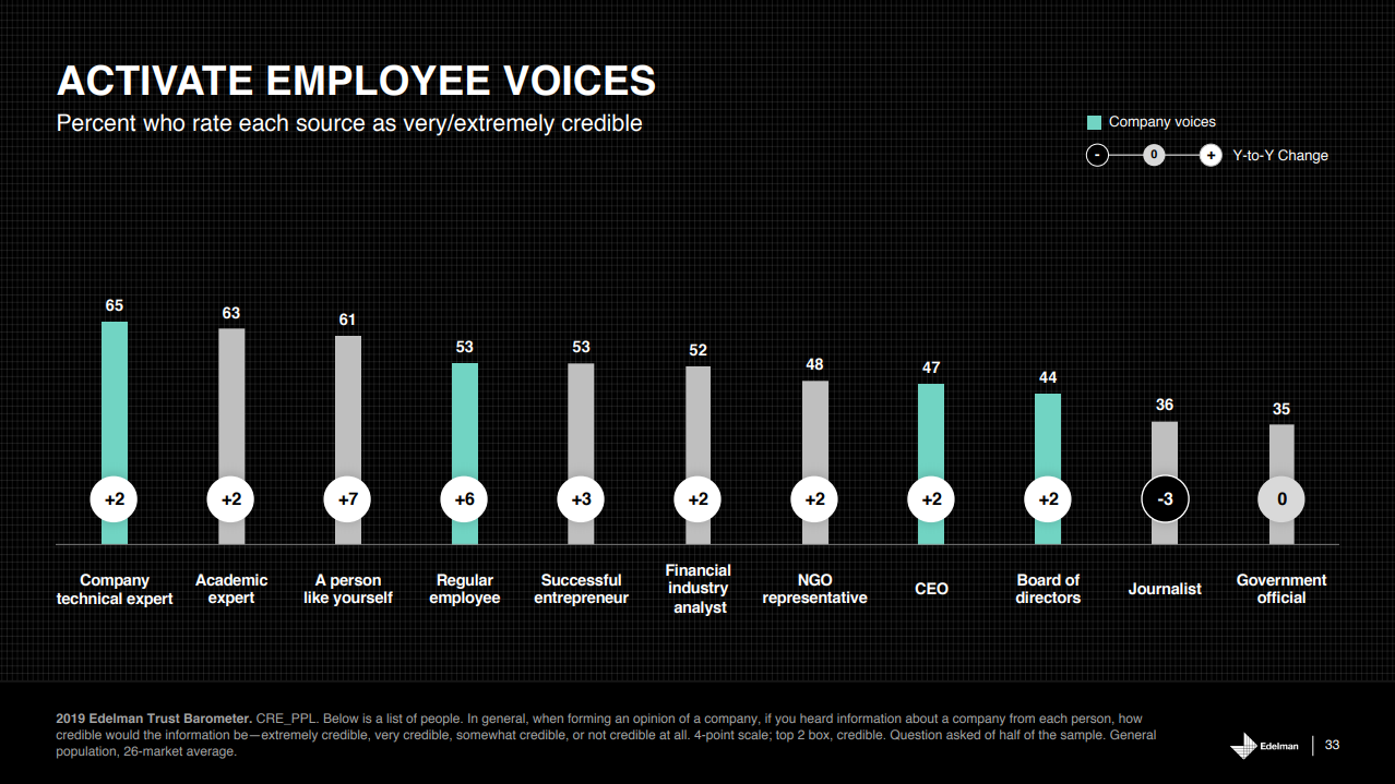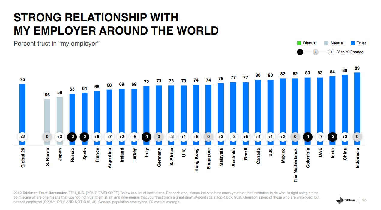 The 2019 Edelman Trust Barometer reveals that trust has changed profoundly in the past year—people have shifted their trust to the relationships within their control, most notably their employers. Globally, 75% of people trust “my employer” to do what is right, significantly more than NGOs (57%), business (56%) and media (47%).