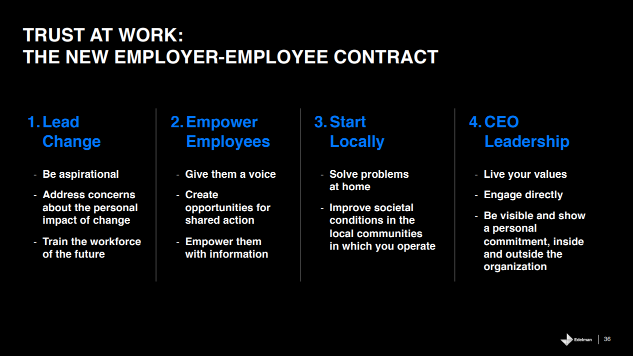 The Edelman 2019 study details 4 components to create a trust environment for employees:
