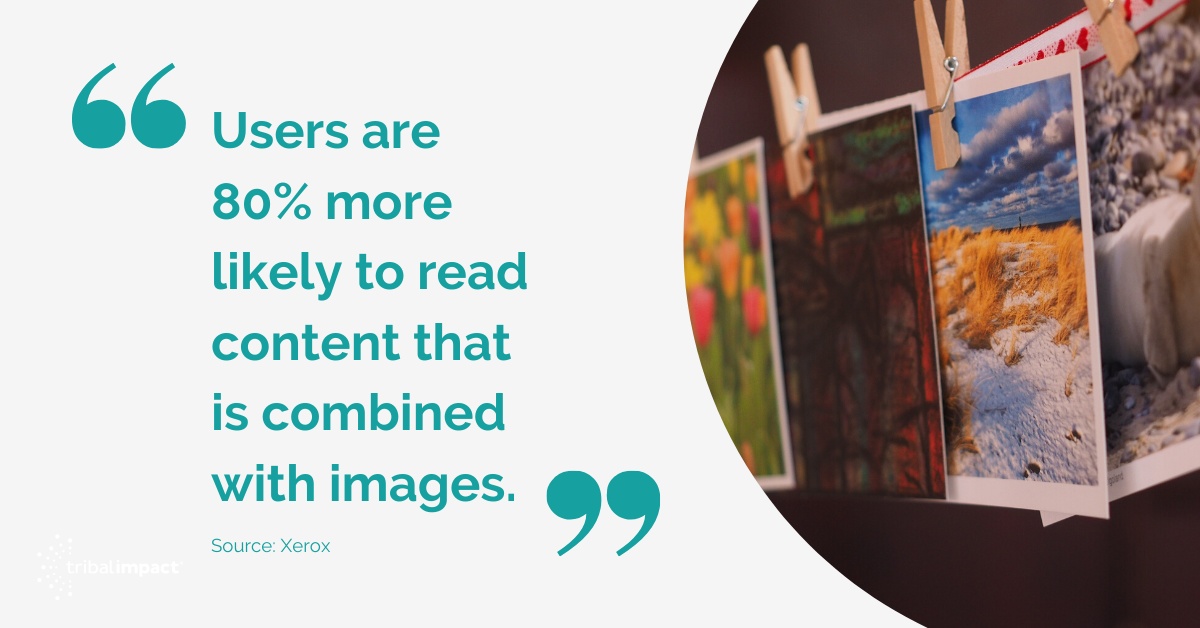You may not think an image will make much difference, but it does. Users are 80% more likely to read content that is combined with images. (Source: Xerox)