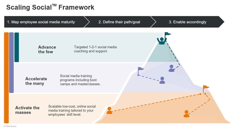 I use our Scaling Social Framework to help frame this (see graphic below). It helps me advise whether to focus strategically on a single stakeholder group, like sales or executives, to show quick results, or to choose to scale holistically, activating multiple groups at once to maximise momentum and create economies of scale. In more mature industries or competitive spaces, the latter can really help accelerate impact.