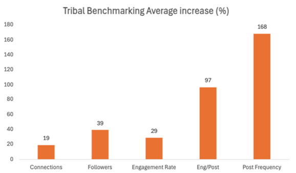 This chart shows the average percentage increases leaders achieve across LinkedIn activity and engagement during when working with Tribal Impact.
