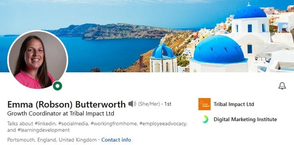 Our own Growth Coordinator, Emma Butterworth, is a great example. She uses a slightly moody, tonal grey background where her face takes centre-stage. She reserves an artsier image for her banner image where she shows Santorini to portray her love of travelling.
