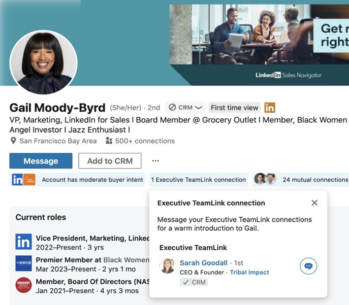 Use buyer intent and category intent signals to identify accounts showing interest in your company and / or products similar to yours. Buyer intent highlights how actively an account is engaging with your company profile, people and content. - Find warm introductions using Team Link