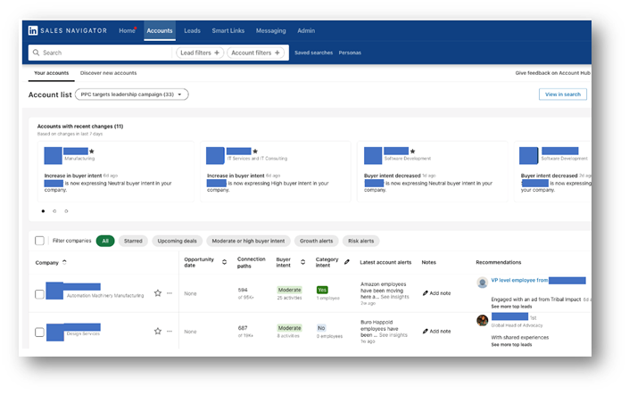 To generate this report, we grabbed all 33 companies that we were targeting via Campaign Manager and uploaded them as an account list directly to Sales Navigator. We did that just before starting the campaign, then monitored the buyer intent changes throughout the time the campaign ran.