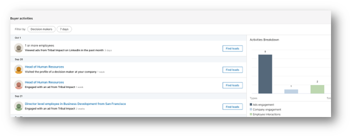 Finally, one of the greatest discoveries during this process was that Sales Navigator’s buyer intent report gave us more information regarding specific engagement with your ads than the Campaign Manager.