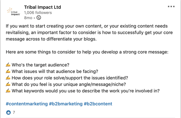 Text only posts perform well on LinkedIn, so if you have a list blog post, for example, take the list items, add an intro and conclusion summing up the points and you have yourself a quick and easy LinkedIn post.