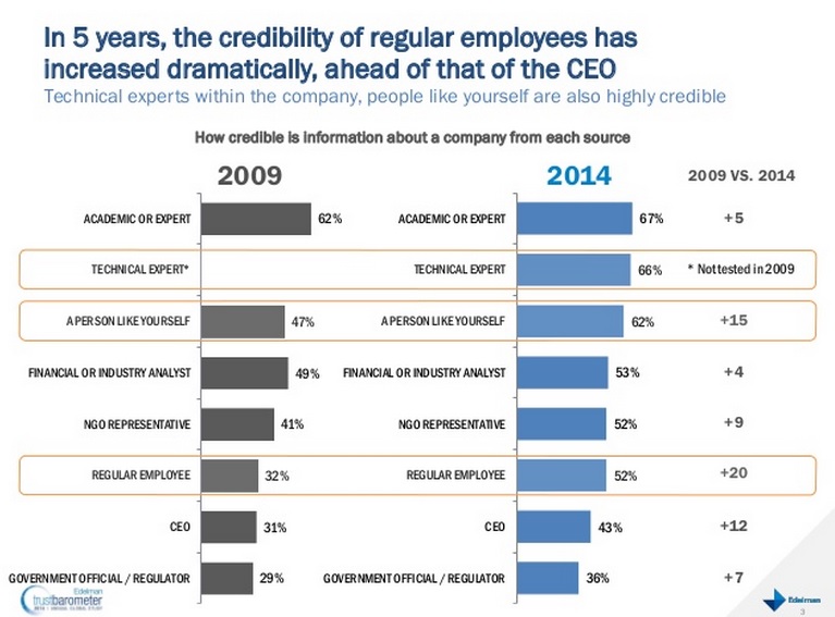 Paid media spend is being redirected to owned and earned . Trust in leaders has increased slightly (12% over last 5 years) but not nearly as much as trust in “regular employees and people like yourself” (20% over last 5 years). See below.